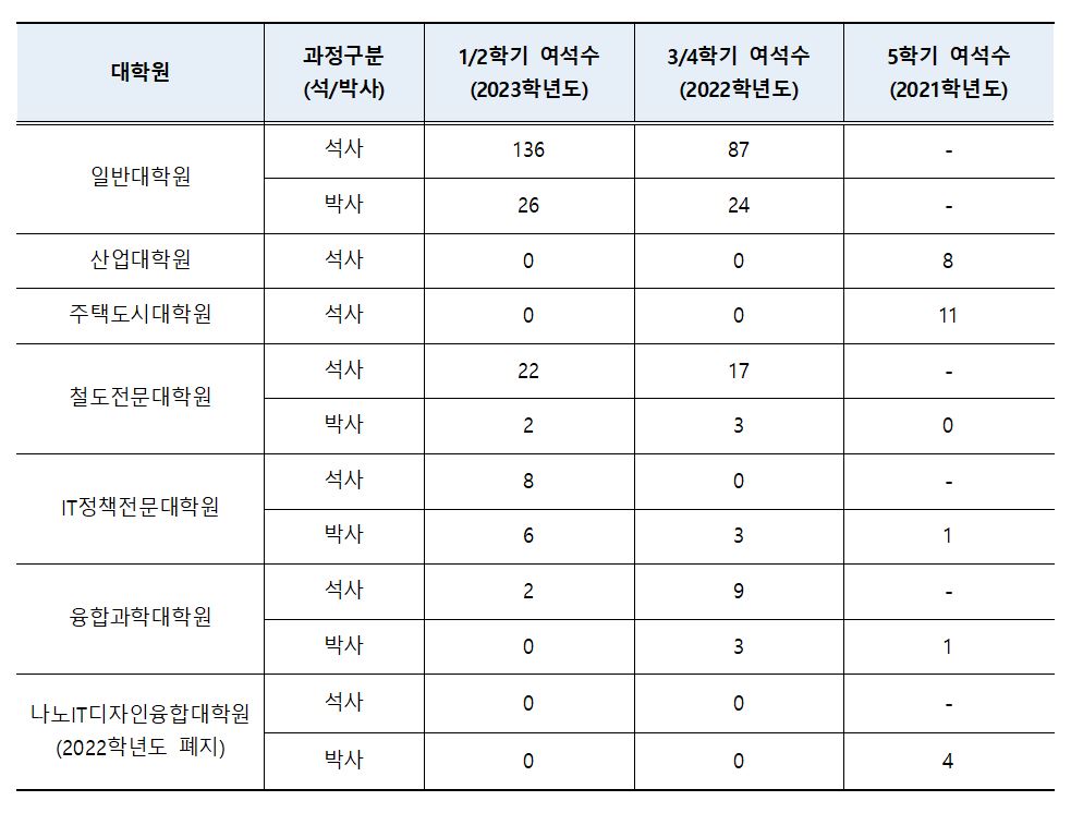 2. 재입학 가능 인원 3. 일정 가. 재입학 신청: 2023. 7. 3.(월) 09:00 ~ 7. 7.(금) 18:00 ※추가신청기간 없습니다. 나. 재입학 발표: 2023. 7. 24.(월) 예정, 대학원공지 게시 다. 수강신청: 2023. 8. 16.(수) ~ 8. 18.(금) 라. 등록: 2023. 8. 30.(수) ~ 9. 1.(금)