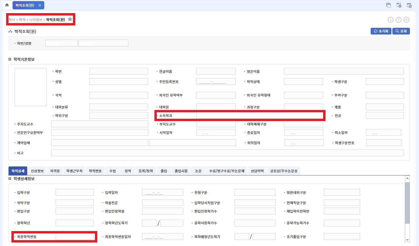 1. 2023학년도 2학기 대학원 전과 허가자 확인 방법 - 통합정보시스템에서 본인 학적 변동 사항 확인 [통합정보시스템>학사>학적>학적관리>학적조회(원)] * 전과 허가 시 소속대학원 및 소속학과가 전과 신청대학원 및 신청학과로 변동되고, 최종학적변동이 전과로 되어있음
