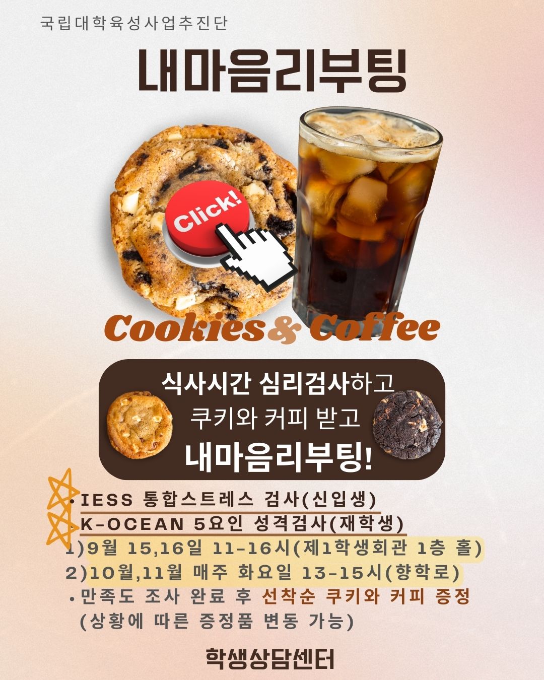 ✔ 참여 방법 1. 오프라인 행사 장소 방문 2. QR코드로 온라인 심리검사 실시 3. 검사 완료 후 만족도 조사 참여 4. 커피와 쿠키 수령! (상황에 따른 증정품 변동 가능)