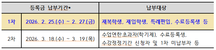 < 2026학년도 1학기 대학원 재·복학생 등록금 납부 일정 안내 >